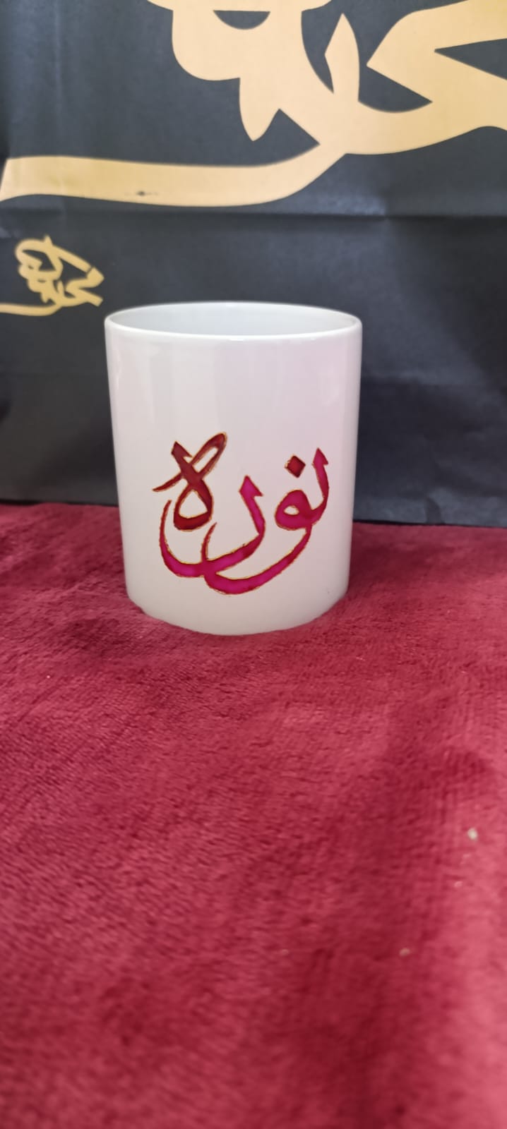 كتابة يدوية بألوان الزجاج على المج بحيث تكون الكتابة ضد الماء