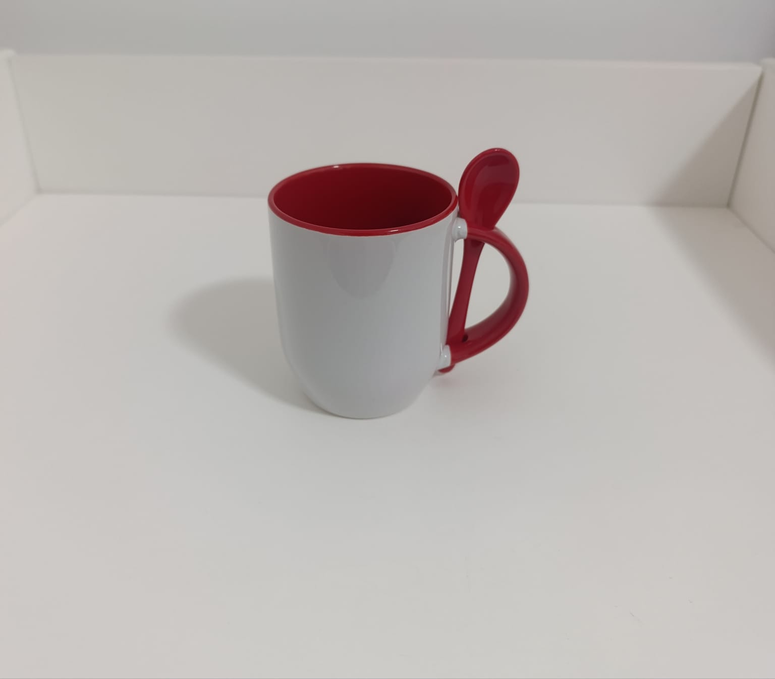 طباعة صورة شخصية أو كتابة بواسطة المكبس الحراري على مج أبيض ومن الداخل لون احمر وملعقة باللون الأحمر