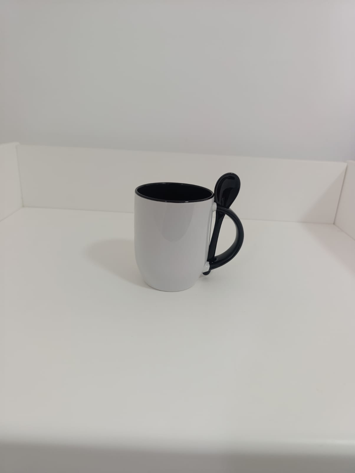 طباعة صورة شخصية أو كتابة بواسطة المكبس الحراري على مج أبيض ومن الداخل لون اسود وملعقة باللون الأسود