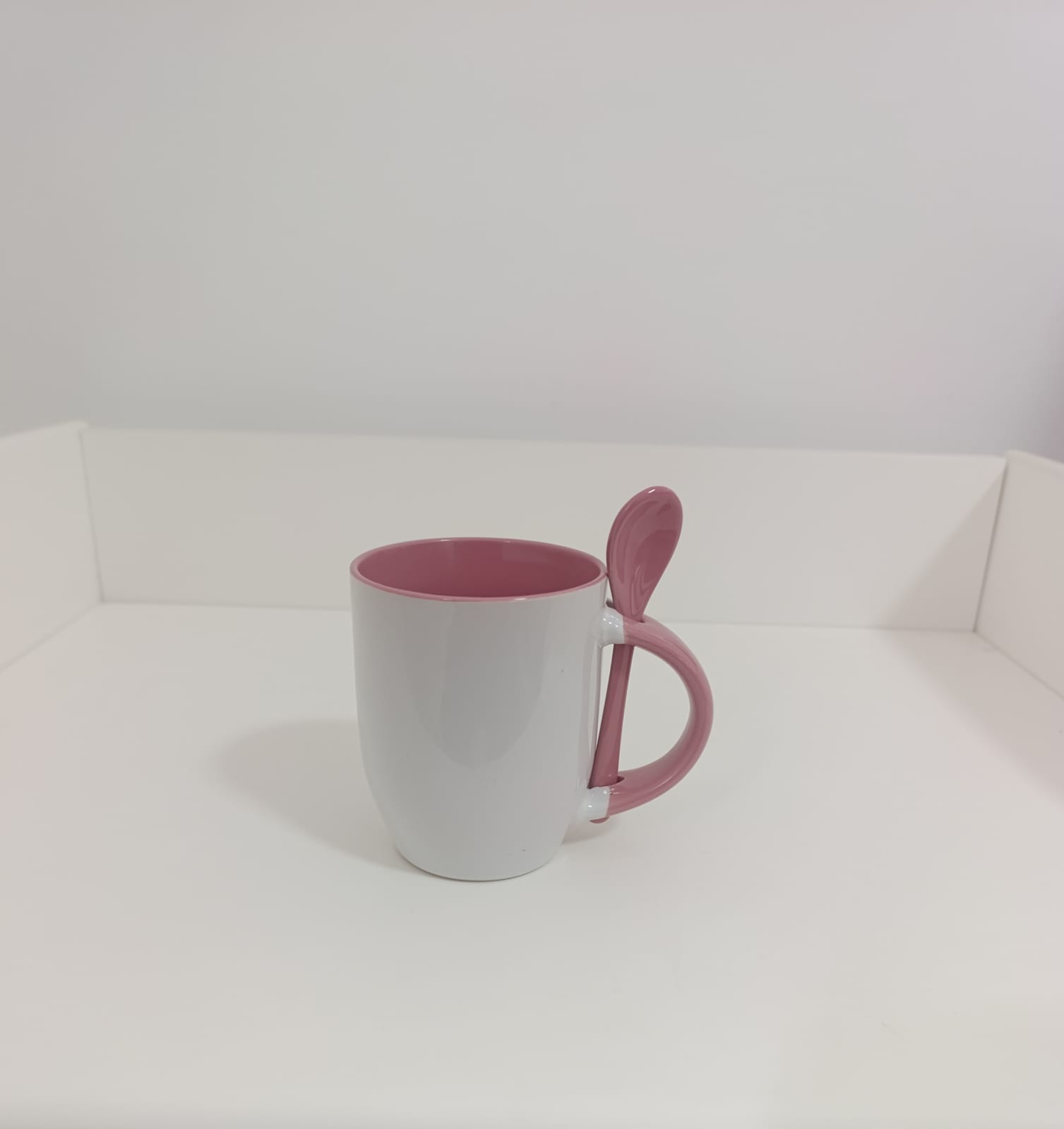 طباعة صورة شخصية أو كتابة بواسطة المكبس الحراري على مج أبيض ومن الداخل لون وردي وملعقة وردية اللون